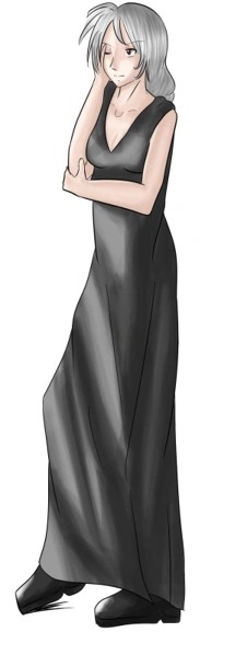 Annie is a brunette, with long gray hair, pinning them in a sloppy braid. She wears a long black dress, with black boots as well.