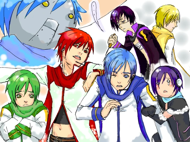 Description - Image of Shion Mekaito, Taito, Kikaito, Kaiko, Kaito, Akaito, Nigaito. An example of Vocaloid Derivatives.